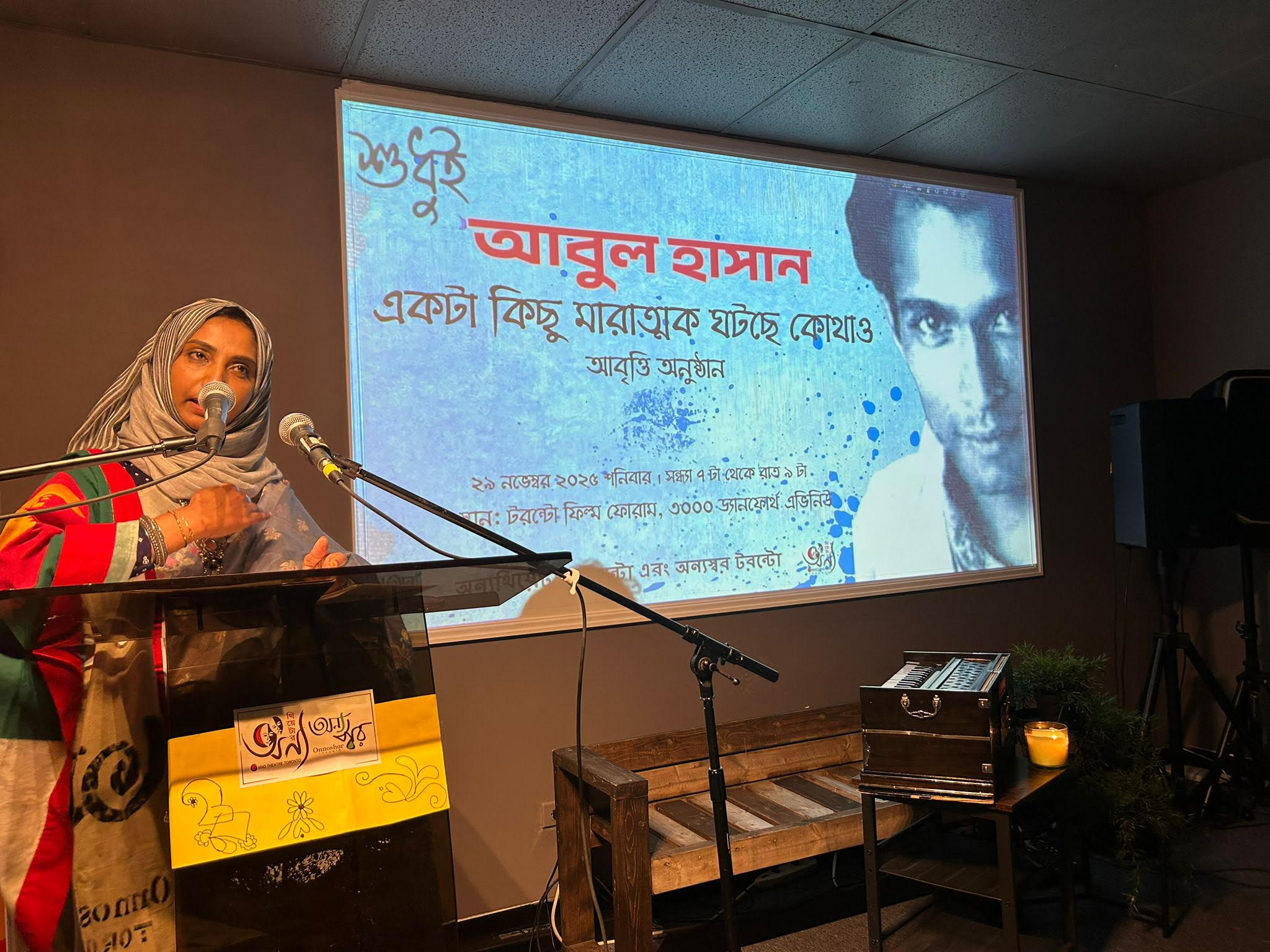 লায়লা নুসরাত, সম্পাদক, প্রবাস বাংলা ভয়েস :: অন্যস্বর টরন্টো এবং অন্যথিয়েটার টরন্টো আয়োজিত “একটা কিছু মারাত্মক ঘটছে কোথাও” শীর্ষক কবি আবুল হাসান এর কবিতা নিয়ে মনোজ্ঞ কবিতা আবৃত্তির অনুষ্ঠানসম্পন্ন হয়েছে টরন্টো ফিল্ম ফোরাম এর চলচ্চিত্র প্রদর্শনী কেন্দ্রে।