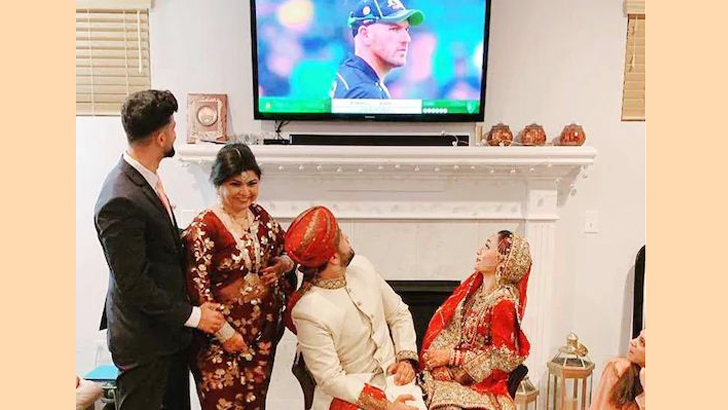 বাংলানিউজসিএ ডেস্ক :: টিভিতে খেলা চলছিল পাকিস্তান বনাম অস্ট্রেলিয়ার। বিয়ের পরই নবদম্পতি সেই টি২০ ম্যাচ দেখতে মগ্ন হয়ে পড়েন।এমন এক ক্রিকেট পাগল দম্পতির দেখা মিলল মার্কিন যুক্তরাষ্ট্রে।বিয়ের সময় খেলা দেখার একটি ছবি বর হাসান তাসলিম আইসিসিকে পাঠিয়েছেন। আর সেই ছবির সন্ধান পাওয়ার পর তা শেয়ার না করে থাকতে পারেনি ক্রিকেটের সর্বোচ্চ এই সংস্থা।