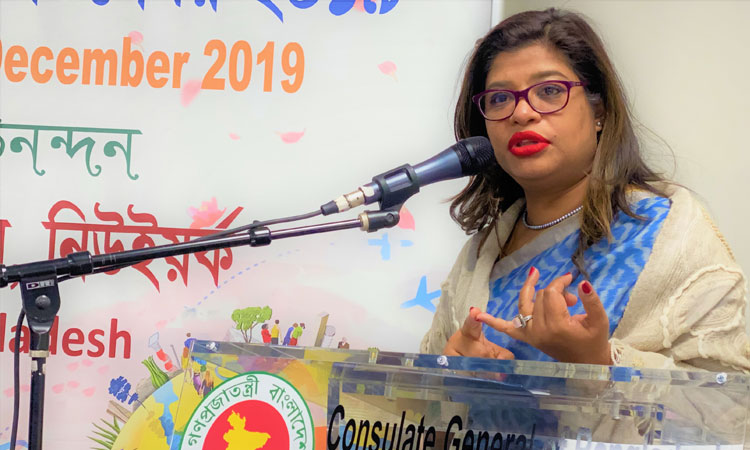 বাংলানিউজসিএ ডেস্ক :: বৈধপথে স্বজনের কাছে অর্থ দেশে পাঠানোর আহ্বান জানিয়েছেন নিউইয়র্কে বাংলাদেশের কনসাল জেনারেল সাদিয়া ফয়জুননেসা। স্থানীয় সময় বুধবার বিকালে নিউইয়র্কে বাংলাদেশ কনস্যুলেট কার্যালয়ে ‘আন্তর্জাতিক অভিবাসী দিবস’ উপলক্ষে আয়োজিত এক অনুষ্ঠানে এ আহ্বান জানান কনসাল জেনারেল। ‘দক্ষ হয়ে বিদেশ গেলে অর্থ সম্মান দুই মেলে’ স্লোগানে আয়োজিত এ অনুষ্ঠানের শুরুতে কনস্যুলেটে আসা সেবাপ্রার্থীদের ফুল ও চকলেট দিয়ে স্বাগত জানানো হয়।