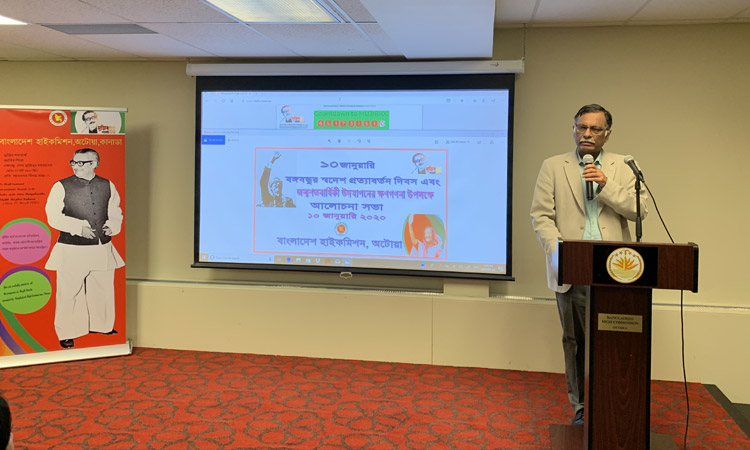 কানাডাস্থ বাংলাদেশ হাই কমিশনে বঙ্গবন্ধুর জন্মশতবার্ষিকী অনুষ্ঠানের ক্ষণগণনা উদ্বোধন সভাপতির বক্তব্যে হাই কমিশনার জাতির পিতার প্রতি শ্রদ্ধা প্রদর্শন করে বলেন, ‘মৃত্যুকে তুচ্ছ করে বঙ্গবন্ধু সমগ্র জাতির আশা-আকাঙ্ক্ষার প্রতীক হয়ে উঠেছিলেন। বঙ্গবন্ধু ও বাঙ্গালি জাতি হয়ে উঠে এক অবিচ্ছিন্ন সত্তা। যে কারণেই তার এ প্রত্যাবর্তন ছিল বিশ্ব রাজনীতির ইতিহাসের এক গুরুত্বপূর্ণ ঘটনা। ১০ জানুয়ারি বঙ্গবন্ধুর রাজনৈতিক জীবনের সার্থকতার এক অভূতপূর্ব মুহূর্ত বলে তিনি উল্লেখ করেন।