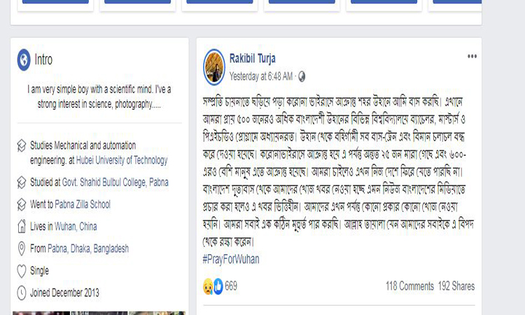 এ নিয়ে গতকাল শনিবার চীনের উহান শহরে বাস করা বাংলাদেশি শিক্ষার্থী রাকিবিল তুর্য সামাজিক যোগাযোগমাধ্যমে লেখেন, আমরা প্রায় ৫০০ জনেরও বেশি শিক্ষার্থী উহানে আটকা পড়েছি। আমরা চাইলেও এখন নিজ দেশে ফিরে যেতে পারছিনা । বাংলাদেশ দূতাবাস থেকে খোঁজ খবর নেয়া হচ্ছে এমন খবর বাংলাদেশের মিডিয়াতে প্রচার করলেও এখবর ভিত্তিহীন। আমরা সবাই এক কঠিন মূহুর্ত পার করছি।চীনে করোনা আতঙ্কে বাংলাদেশি শিক্ষার্থীরা, সাহায্য না পাওয়ার অভিযোগ