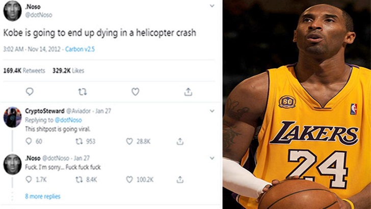 বাংলানিউজসিএ ডেস্ক :: একি কাকতালীয় নাকি অলৌকিক? আট বছর আগে কীভাবে একজন বলে দেন, যুক্তরাষ্ট্রের বাস্কেটবল খেলোয়াড় কোবি ব্রায়ান্টের মৃত্যু হবে হেলিকপ্টার ভেঙে পড়ে! শেষ পর্যন্ত তা-ই হলো।গত ২৬ জানুয়ারি সকালে মর্মান্তিক হেলিকপ্টার দুর্ঘটনায় নিহত হন কোবি। এর আগে ২০১২ সালের ১৪ নভেম্বর সোশ্যাল মিডিয়া টুইটারে নোসো লেখেন, হেলিকপ্টার ভেঙে পড়ে মারা যাবেন তিনি। স্বভাবতই মার্কিন বাস্কেটবল কিংবদন্তির মৃত্যুর পর পোস্টটি সামনে আসায় সোশ্যাল অ্যাক্টিভিস্টদের গা শিউরে উঠেছে।