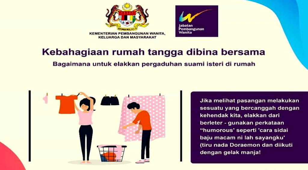 বাংলানিউজসিএ ডেস্ক :: মালয়েশিয়ার মহিলা ও পরিবার কল্যাণ মন্ত্রণালয়ের ফেসবুক পেজে ‘পরিবার ও গৃহস্থালির সুখ’ নিয়ে একের পর এক নারী বিদ্বেষী পোস্টার প্রকাশ করায় দেশটির নারীরা ক্ষেপে গেছে। করোনাভাইরাসের কারণে দেশব্যাপী লকডাউনের সময় স্বামীদের জ্বালাতন না করতে নারীদের পরামর্শ দিয়েছে মালয়েশিয়া সরকার। একইসঙ্গে বাড়িতে কাজ করার সময় সুন্দর পোশাক ও মেকআপ ব্যবহারের পরামর্শ দেওয়া হয়েছে।