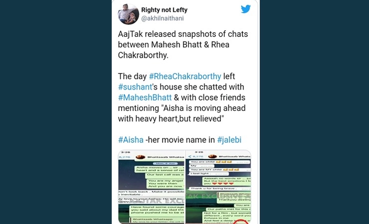 গণমাধ্যম থেকে জানা যায় সেই চ্যাট আলাপে রিয়াই প্রথমে মহেশকে জানান তিনি মুভ অন করতে পেরেছেন। রিয়া চ্যাটে লেখেন, ‘স্যার, দুঃখ জমা হৃদয় আর পরিতৃপ্তি নিয়ে আয়েশা (জলেবি ছবিতে রিয়ার নাম) বলছে সে মুভ অন করে গিয়েছে। আমাদের ওই শেষ ফোনটি আমার কাছে ওয়েক আপ কল। আপনি আমার এঞ্জেল। তখনও ছিলেন আর এখনও।’মহেশ রিয়াকে ফোনে দেন এর ঠিক ১২ মিনিট পর।