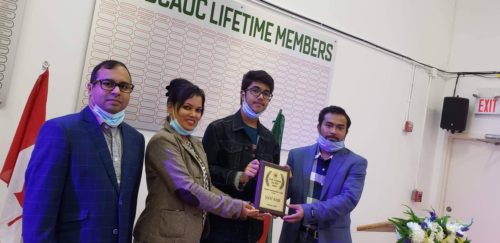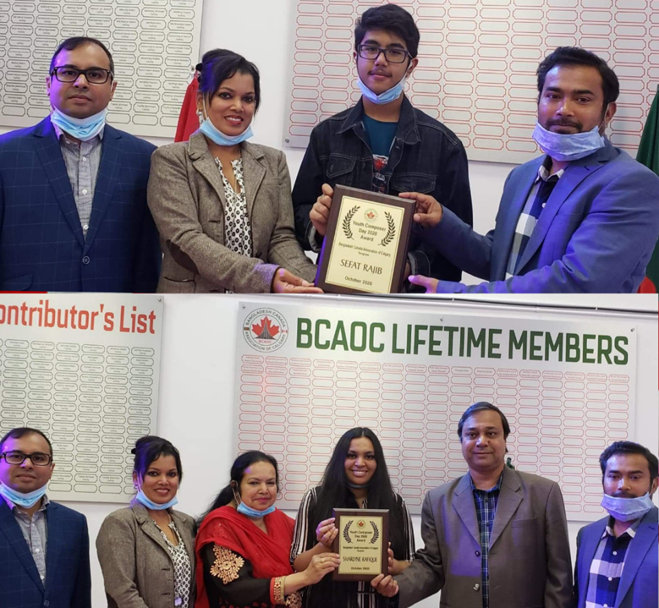 এ বছর করোনার কারনে সামাজিক দুরুত্ব বজায় রেখে এক অনাড়ম্বর আয়োজনের মধ্য দিয়ে নতুন প্রজন্মের সিফাত ও শারলিনের হাতে ইয়ূথ কম্পোজারের স্বীকৃতি স্বরূপ ক্রেস্ট তুলে দেন বাংলাদেশ কানাডা অ্যাসোসিয়েশন অফ ক্যালগেরির সভাপতি মোঃ রশিদ রিপন। এসময় উপস্থিত ছিলেন সাধারণ সম্পাদক জয়ন্ত বসু ও সহ সভাপতি রীতা কর্মকার এবং নতুন প্রজন্মের অভিভাবকরা।