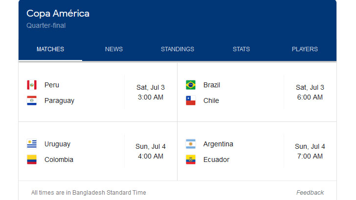 আগামী শনিবার (৩ জুলাই) রাত ৩টায় গোইয়ানিয়ার অলিম্পিকো স্টেডিয়ামে হবে ‘বি’ গ্রুপের পেরু বনাম প্যারাগুয়ের ম্যাচ।আর ব্রাসিলিয়ার মানে গারিঞ্চা স্টেডিয়ামে পর দিন (রোববার) তৃতীয় কোয়ার্টার-ফাইনালে কলম্বিয়ার প্রতিপক্ষ প্রতিযোগিতার সর্বোচ্চ ১৫ বারের চ্যাম্পিয়ন উরুগুয়ে।