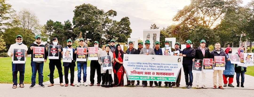 আহসান রাজীব বুলবুল, প্রধান সম্পাদক, প্রবাস বাংলা ভয়েস :: বাংলাদেশে বিভিন্ন জেলায় হিন্দু সম্প্রদায়ের উপর চলমান সংঘবদ্ধ বর্বরোচিত অত্যাচার, হত্যা, নির্যাতন, ভয়ভীতি প্রদর্শন, পূজা মন্ডপ ও প্রতিমা ভাংচুর, এবং নিগ্রহের প্রতিবাদে শনিবার ২৩শে অক্টোবর বাংলাদেশ আওয়ামী লীগ, অন্টারিও,কানাডা. টরেন্টোর কেন্দ্রীয় শহীদ মিনার প্রাঙ্গনে এক প্রতিবাদ সভা ও মানবন্ধন পালন করেন।