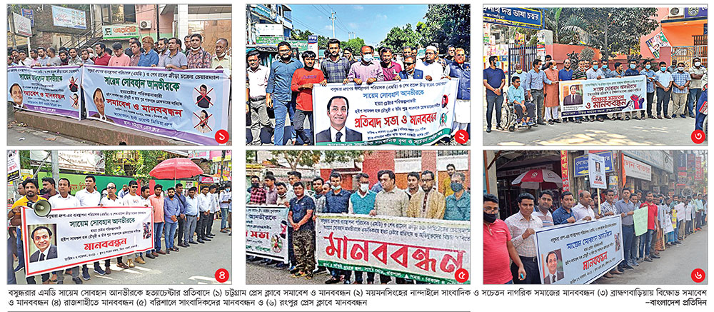 জাহিদুর রহমান জনি বলেন, ‘সায়েম সোবহান আনভীর শুধু বসুন্ধরা গ্রুপের রত্ন নন, তিনি সারা দেশের রত্ন। তাই মাননীয় প্রধানমন্ত্রীর কাছে দাবি জানাই, তাঁকে রক্ষা করে শারুনসহ তার সঙ্গে হত্যাচেষ্টায় জড়িতদের গ্রেফতার করে আইনের আওতায় আনা হোক।’ ব্যবসায়ী মোশাররফ হোসেন খন্দকার বলেন, ‘বসুন্ধরা গ্রুপের এমডি ও শেখ রাসেল ক্রীড়া চক্রের চেয়ারম্যানকে হত্যার উদ্দেশ্যে লোক ভাড়াকারী হুইপ ও তার ছেলে শারুনের শাস্তি কামনা করছি ভাটারাবাসী।’ মানববন্ধন শেষে প্রগতি সরণি থেকে একটি বিক্ষোভ মিছিল শুরু হয়ে বারিধারা ফায়ার স্টেশনের সামনে এসে শেষ হয়। এ সময় ‘বিচার চাই, বিচার চাই, শারুনের বিচার চাই’, ‘ফাঁসি চাই, ফাঁসি চাই, শারুনের ফাঁসি চাই’সহ বিভিন্ন স্লোগান দেন বিক্ষোভকারীরা। চট্টগ্রাম : বসুন্ধরার এমডিকে হত্যাচেষ্টার প্রতিবাদে চট্টগ্রামে সাংবাদিকদের মানববন্ধন থেকে পেশাজীবী জনতার সমাবেশ করার ঘোষণা দেওয়া হয়েছে। চট্টগ্রাম প্রেস ক্লাবের সামনে গতকাল বিকালে অনুষ্ঠিত হয় দেশের বৃহত্তম শিল্পগোষ্ঠী বসুন্ধরা গ্রুপের ব্যবস্থাপনা পরিচালক (এমডি) ও শেখ রাসেল ক্রীড়া চক্রের চেয়ারম্যান সায়েম সোবহান আনভীরকে একাধিকবার হত্যাচেষ্টার প্রতিবাদে মানববন্ধন। এতে বিএফইউজে-বাংলাদেশ ফেডারেল সাংবাদিক ইউনিয়নের সাবেক সহ-সভাপতি ও পেশাজীবী সমন্বয় পরিষদের সাধারণ সম্পাদক রিয়াজ হায়দার চৌধুরী বলেন, ‘বসুন্ধরা গ্রুপের এমডির বিরুদ্ধে একের পর এক ষড়যন্ত্র হচ্ছে, যা চট্টগ্রামের সাংবাদিকরা বরদাস্ত করবে না। শেষ রক্তবিন্দু দিয়ে হলেও এই ষড়যন্ত্রের প্রতিবাদ জানাব।’ দেশের বৃহৎ শিল্প গ্রুপ বসুন্ধরার বিরুদ্ধে ষড়যন্ত্রের প্রতিবাদে আরও বৃহত্তর আঙ্গিকে পেশজীবী-জনতার সমাবেশ করার ঘোষণা দিয়ে তিনি বলেন, বসুন্ধরা গ্রুপের ব্যবস্থাপনা পরিচালক সায়েম সোবহান আনভীরকে হত্যার চেষ্টা মূলত দেশের উন্নয়নে অবদান রাখা শিল্পগ্রুপগুলোর বিরুদ্ধেই ষড়যন্ত্র। প্রকারান্তরে তা রাষ্ট্রশক্তিকে চ্যালেঞ্জ করার শামিল। গণমাধ্যমের বৃহৎ প্রণোদনাকারী প্রতিষ্ঠান হিসেবে বসুন্ধরার বিরুদ্ধে এই ষড়যন্ত্রের প্রতিবাদ জানানো দেশের সব গণমাধ্যমকর্মীর দায়িত্ব। তিনি করোনাকালীন সাংবাদিক প্রণোদনা, হকারসহ গণমাধ্যমের প্রতিটি ক্ষেত্রে ও সামাজিক-মানবিক খাতে বসুন্ধরার এমডির সহায়তার বিষয়টি তুলে ধরেন। রিয়াজ হায়দার চৌধুরী বলেন, সম্প্রতি অকাল প্রয়াত চট্টগ্রামের আলোকচিত্র সাংবাদিক দিদারুল আলমের পরিবারকে চট্টগ্রাম সাংবাদিক ইউনিয়নের (সিইউজে) মাধ্যমে ১০ লাখ টাকা অনুদান দিয়েছেন বসুন্ধরা গ্রুপের এমডি। এখানেই শেষ নয়, করোনায় প্রয়াত সাংবাদিকদের পরিবারকেও অনুদান দিয়েছে এ শিল্পগ্রুপ। পাশাপাশি সামা
