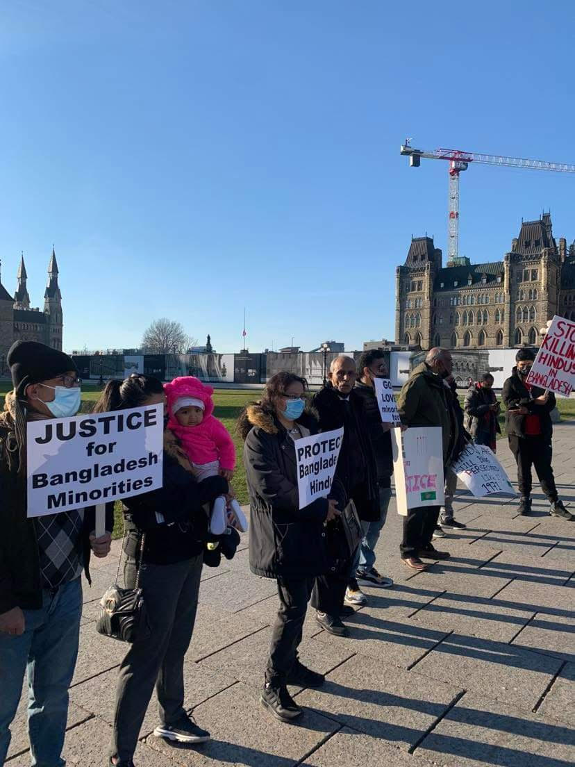 ‘স্টপ অ্যাটাক হিন্দুজ ইন বাংলাদেশ’, ‘উই ওয়ান্ট জাস্টিস’…‘স্টপ ভায়োলেন্স অ্যাগেনস্ট হিন্দুজ’ এসব শ্লোগানে শ্লোগানে মুখরিত করে বাংলাদেশ আর ক্যানাডার পতাকা উড়িয়ে আর হৃদয়ে ধারণ করে রকমারি ব্যানার ফেস্টুন, প্লেকার্ড নিয়ে সোমবার কর্মদিবসে বিপুল সংখ্যক প্রবাসী নারী-পুরুষরা ঐক্যবদ্ধভাবে ‘ বাংলাদেশী হিন্দু কমিউনিটি অব মন্ট্রিয়ল কানাডার’ ব্যানারে রাজধানী অটোয়ার পার্লামেন্টের সামনে মানববন্ধন কর্মসূচী পালন করে। অসংখ্য প্রতিবাদী কন্ঠে উচ্চারিত হয় বিভিন্ন শ্লোগানসহ গণসংগীত।
