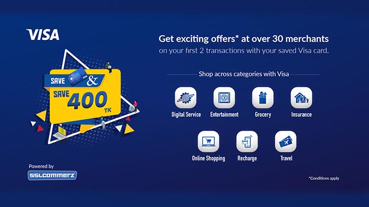 ভিসা এবং এসএসএলকমার্জ যৌথভাবে এই ক্যাম্পেইনটি পরিচালনা করছে এবং এর আগেও বাংলাদেশের ই-কমার্স খাতে সচেতনতা সৃষ্টি, প্রচারণা এবং মানোন্নয়নে যৌথভাবে বেশকিছু উদ্যোগ নিয়েছে প্রতিষ্ঠান দুটি। সেভ অ্যান্ড সেভ অফার ক্যাম্পেইনটি চলবে ২৪ সেপ্টেম্বর ২০১৯ পর্যন্ত। এ সম্পর্কে আরও বিস্তারিত জানা যাবে www.sslcommerz.com/visa এই ঠিকানায়।