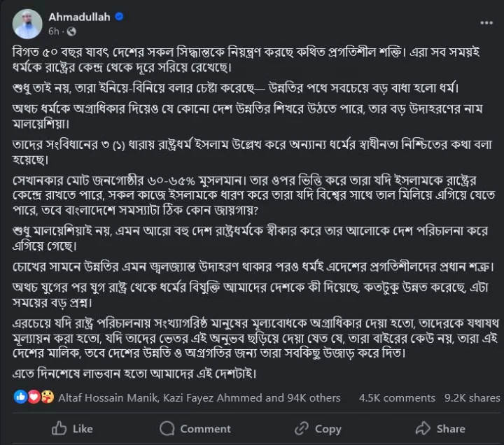 শুধু তা-ই নয়, তারা ইনিয়ে-বিনিয়ে বলার চেষ্টা করেছে—উন্নতির পথে সবচেয়ে বড় বাধা হলো ধর্ম। অথচ ধর্মকে অগ্রাধিকার দিয়েও যে কোনো দেশ উন্নতির শিখরে উঠতে পারে, তার বড় উদাহরণের নাম মালয়েশিয়া। তাদের সংবিধানের ৩(১) ধারায় রাষ্ট্রধর্ম ইসলাম উল্লেখ করে অন্যান্য ধর্মের স্বাধীনতা নিশ্চিতের কথা বলা হয়েছে। তার ওপর ভিত্তি করে তারা যদি ইসলামকে রাষ্ট্রের কেন্দ্রে রাখতে পারে, সব কাজে ইসলামকে ধারণ করে তারা যদি বিশ্বের সঙ্গে তাল মিলিয়ে এগিয়ে যেতে পারে, তবে বাংলাদেশে সমস্যাটা ঠিক কোন জায়গায়? প্রশ্ন রাখেন শায়খ আহমাদুল্লাহ।